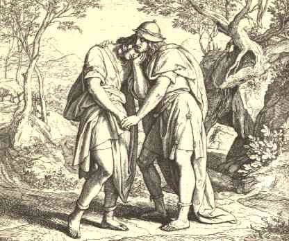 41 | And as soon as the lad was gone, David arose out of a place toward the south, and fell on his face to the ground, and bowed himself three times: and they kissed one another, and wept one with another, until David exceeded.