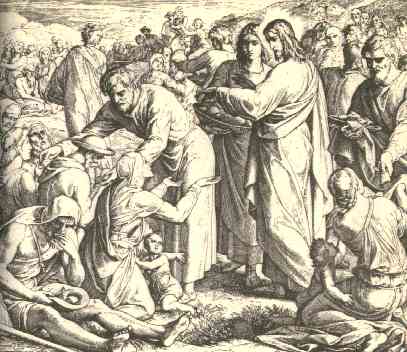 11 | And Jesus took the loaves; and when he had given thanks, he distributed to the disciples, and the disciples to them that were set down; and likewise of the fishes as much as they would. |