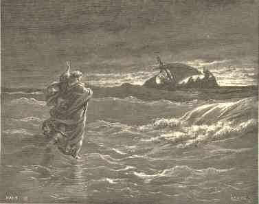 19 | So when they had rowed about five and twenty or thirty furlongs, they see Jesus walking on the sea, and drawing nigh unto the ship: and they were afraid.